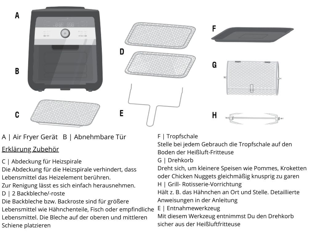 Die zubereiteten Speisen werden wunderbar knusprig und saftig, bei wenig Fettzugabe bzw. ohne Fettzugabe bei vorfrittierten Lebensmitteln. Auf dem Grillspieß passt ein ganzes Hähnchen und im Dreh-Korb können zum Beispiel Pommes Frites zubereitet werden. Auf den 2 Backblechen kann man gleichzeitig eine große Menge Fleisch, Kartoffeln, Gemüse usw. rösten/grillen.