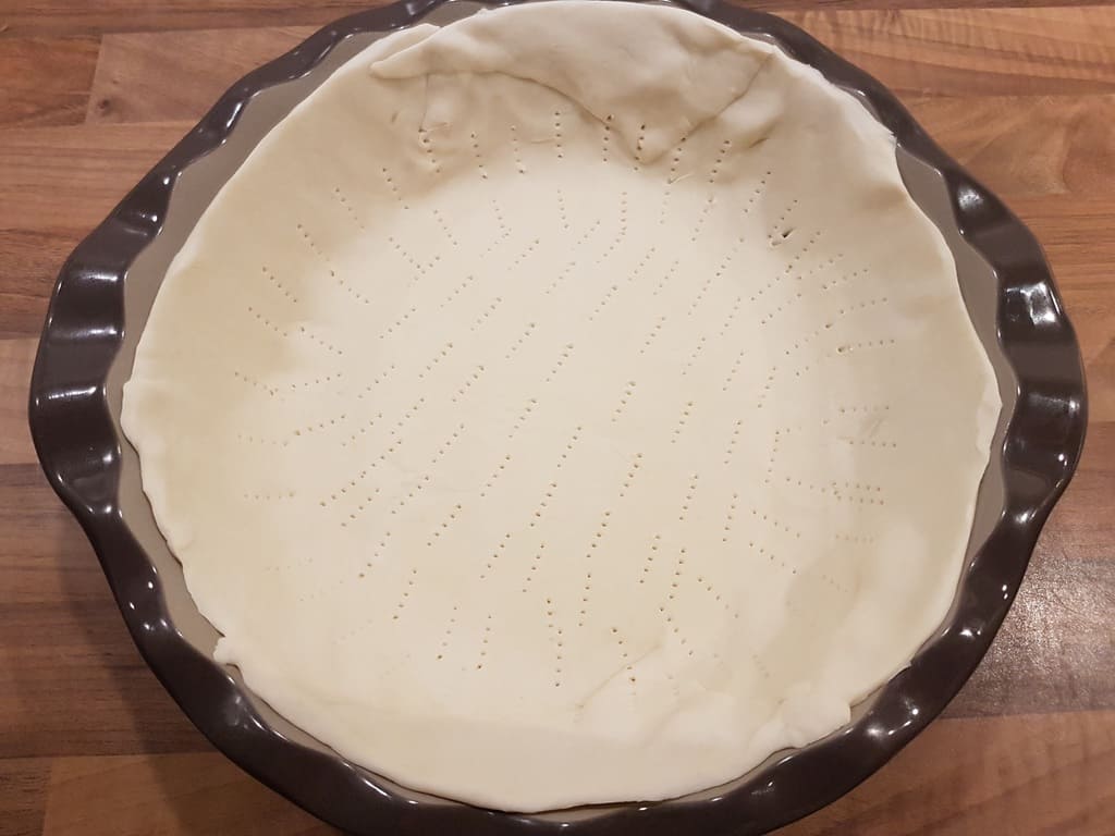 Blätterteig in der Pieform auslegen und den rest Teig drum herum weg schneiden.