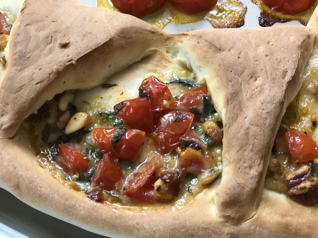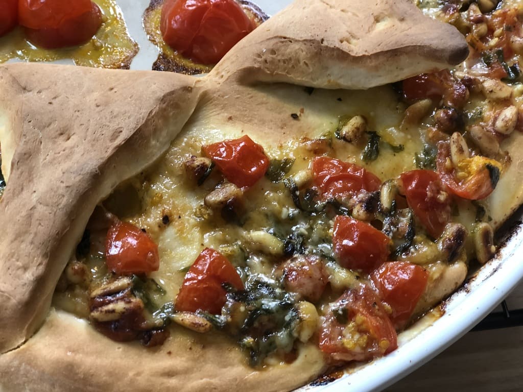 Der große Runde Stein für 25 Min bei 230 Grad Ober- / Unterhitze unterste Schiene in den vorheizten Backofen.