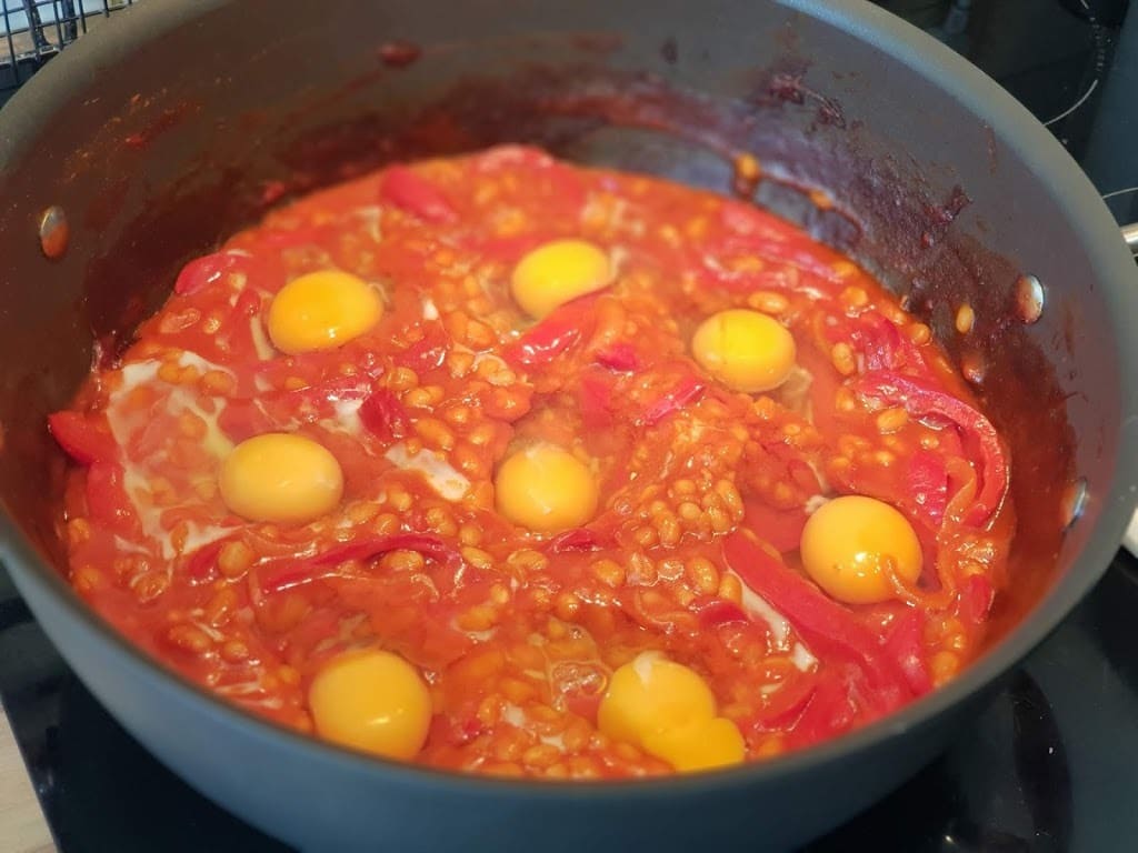 Nun die Baked Beans hinzufügen und alles miteinander vermischen.