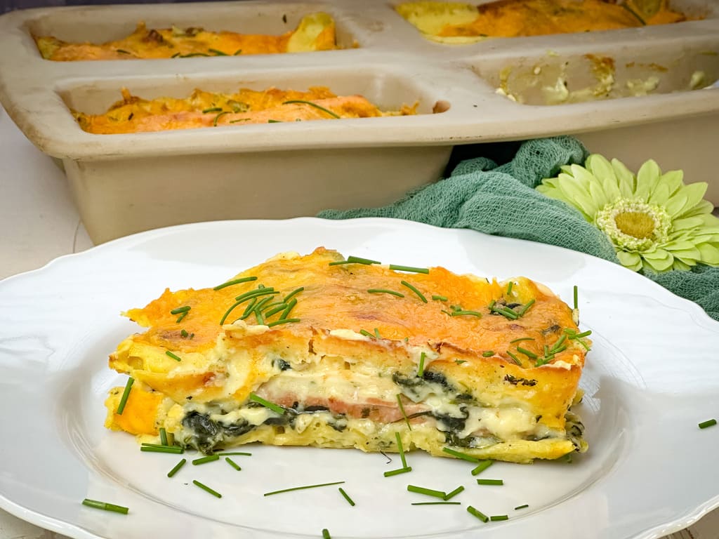 Jetzt je ein Spiegelei in die Mulden geben und den Schichtvorgang wiederholen.