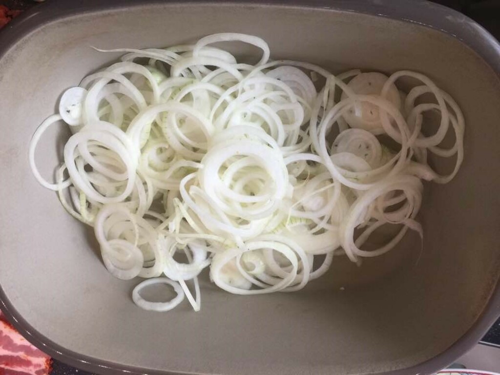 Die Zwiebeln in hauchdünne Zwiebelringe schneiden, in den gefetteten Ofenmeister legen und den Braten auf das Zwiebelbett legen.