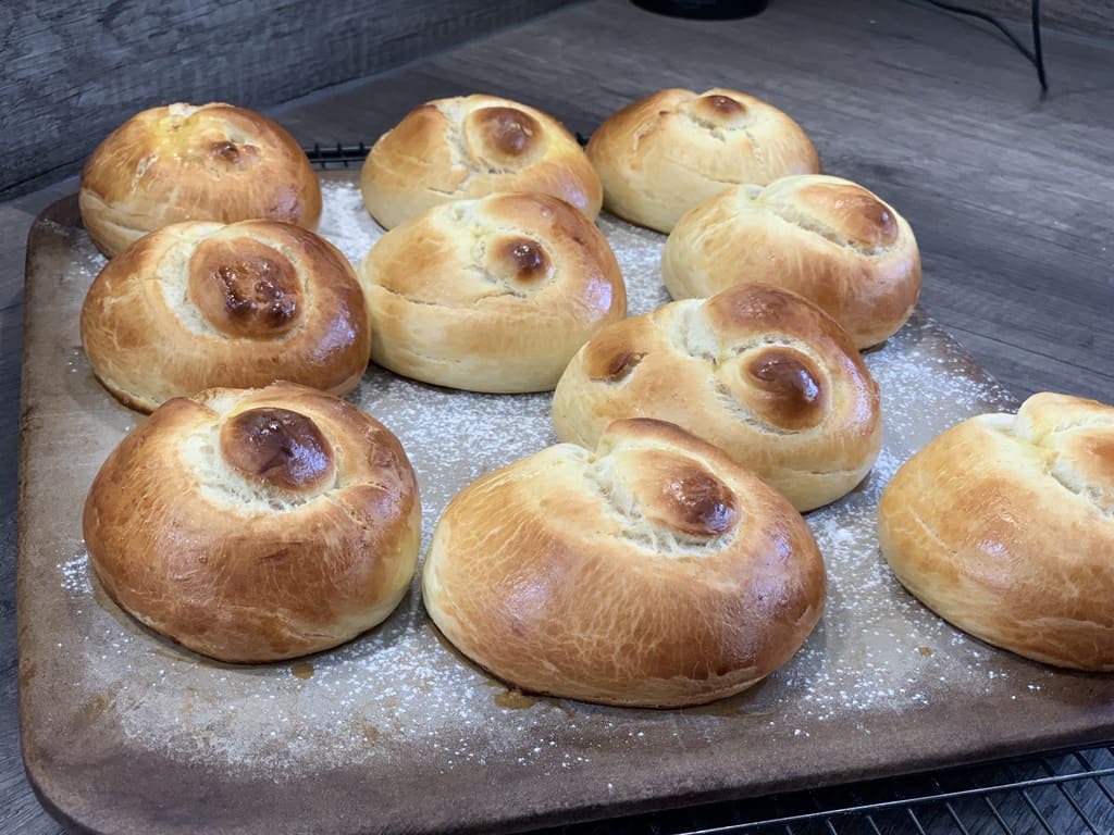 Den Teig in zehn gleich große Teile teilen, jeweils zu einem Strang rollen und Knoten daraus formen. Natürlich gehen auch “normale Brötchen”.