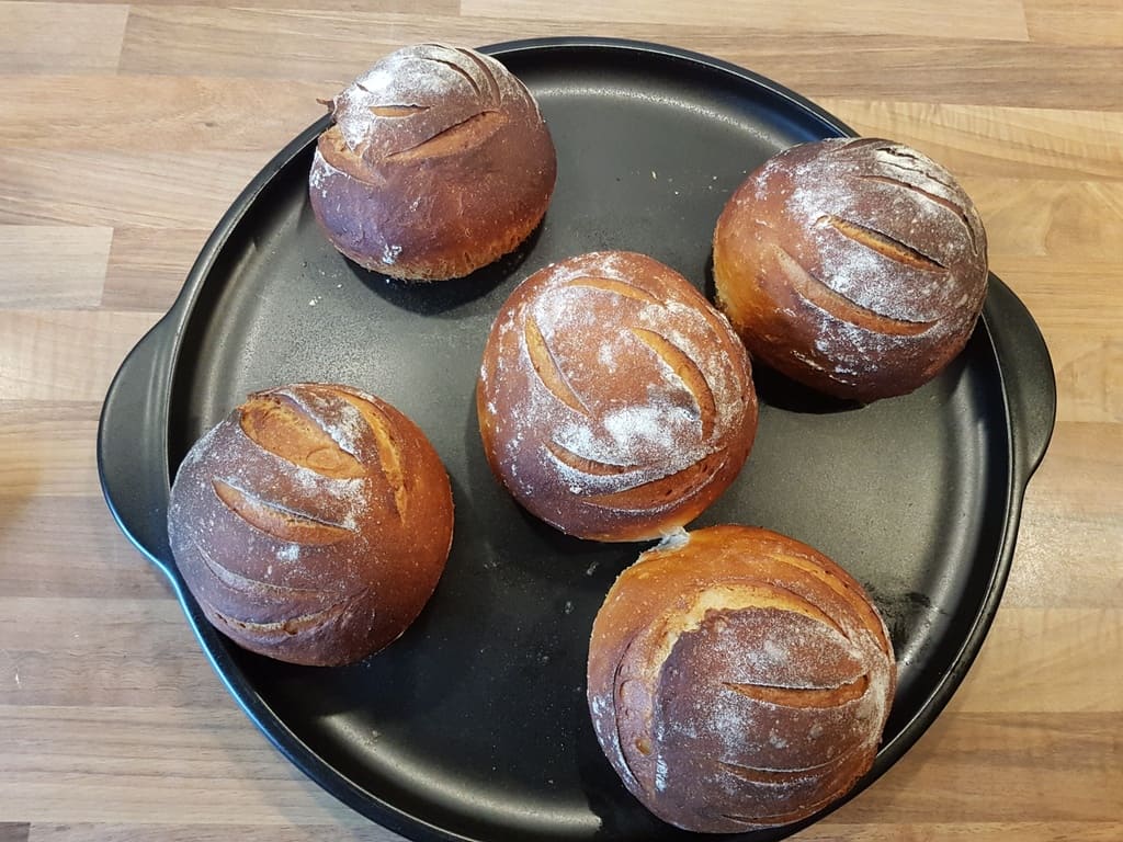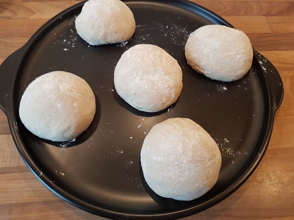 Teig in 5 Teile teilen, rund formen und etwas bemehlen. Auf einen Ofenzauberer oder ROCKCROK legen und ca. 20 Min mit einem Tuch abdecken.