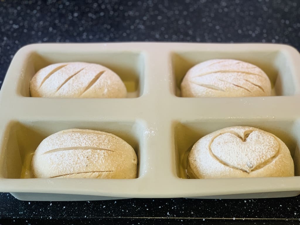 Die Mini-Kastenform einfetten, mit Mehl ausstreuen und die Teiglinge in die Mulden legen.