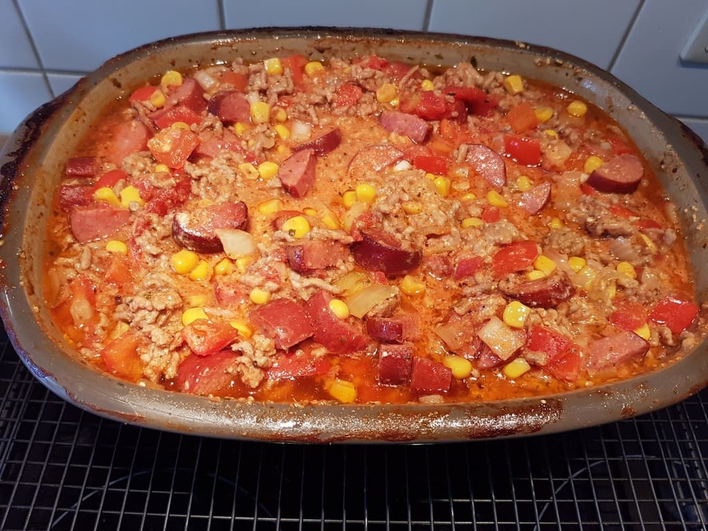 Die passierten und gehackten Tomaten, Mais, sämtliche Gewürze, das angebratene Hackfleisch und den Schmelzkäse dazu geben und alles im Ofenmeister vermischen.
