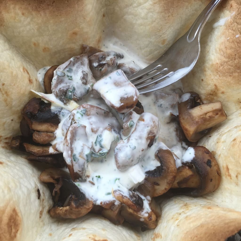 Die Körbchen nur noch mit den Champingons füllen, Knofi Dip rüber und genießen.