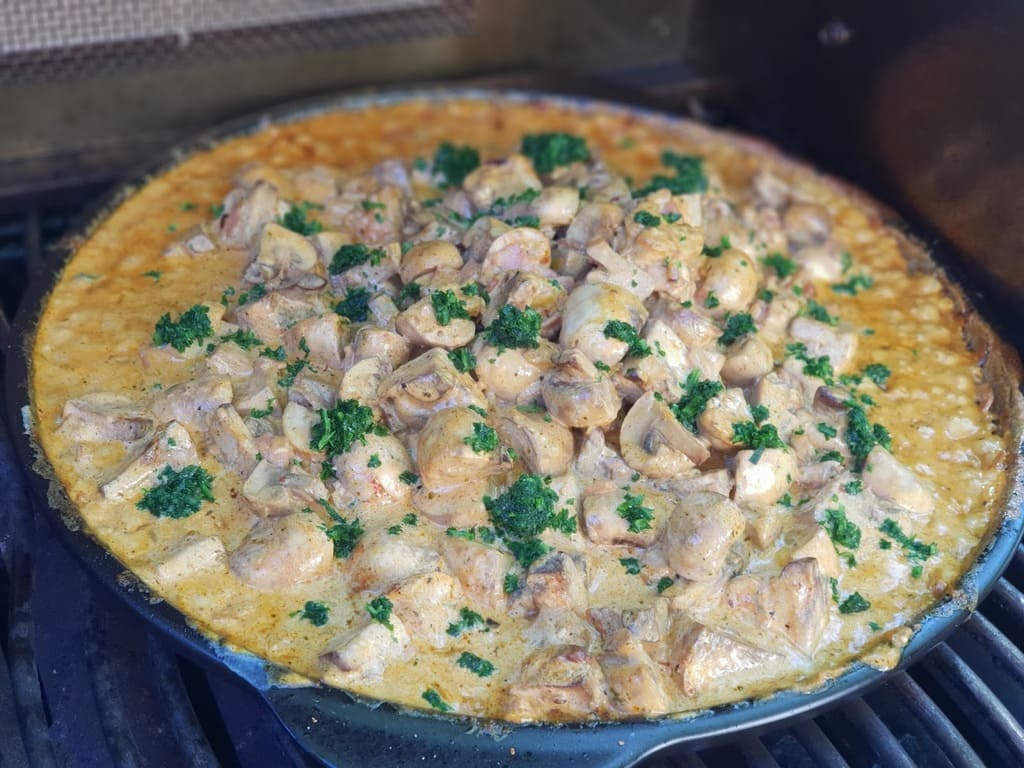 Pilze hinzufügen und den Deckel vom Grill für ca 8 Min schließen.