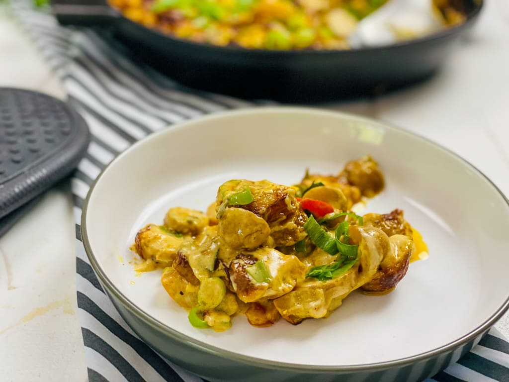 Frühlingszwiebeln in Steifen geschnitten über die Kartoffeln geben und genießen.