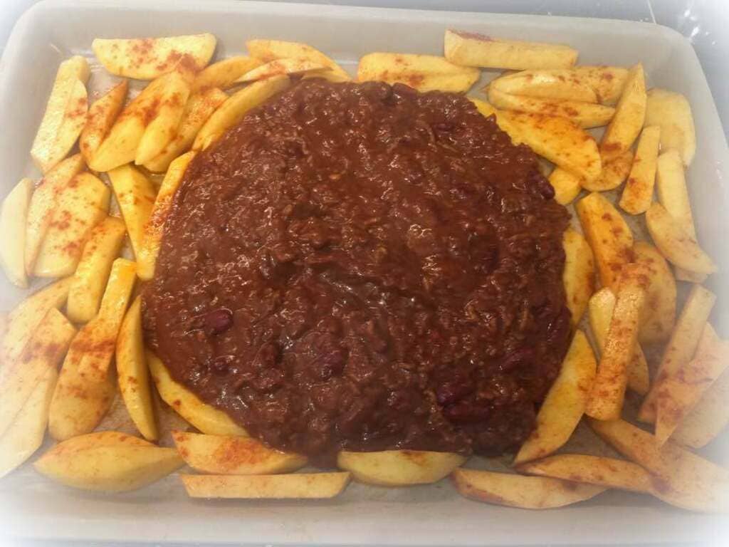 Die marinierten Kartoffelspalten nun auf dem gr. Ofenzauberer verteilen und das Chili in die Mitte geben.