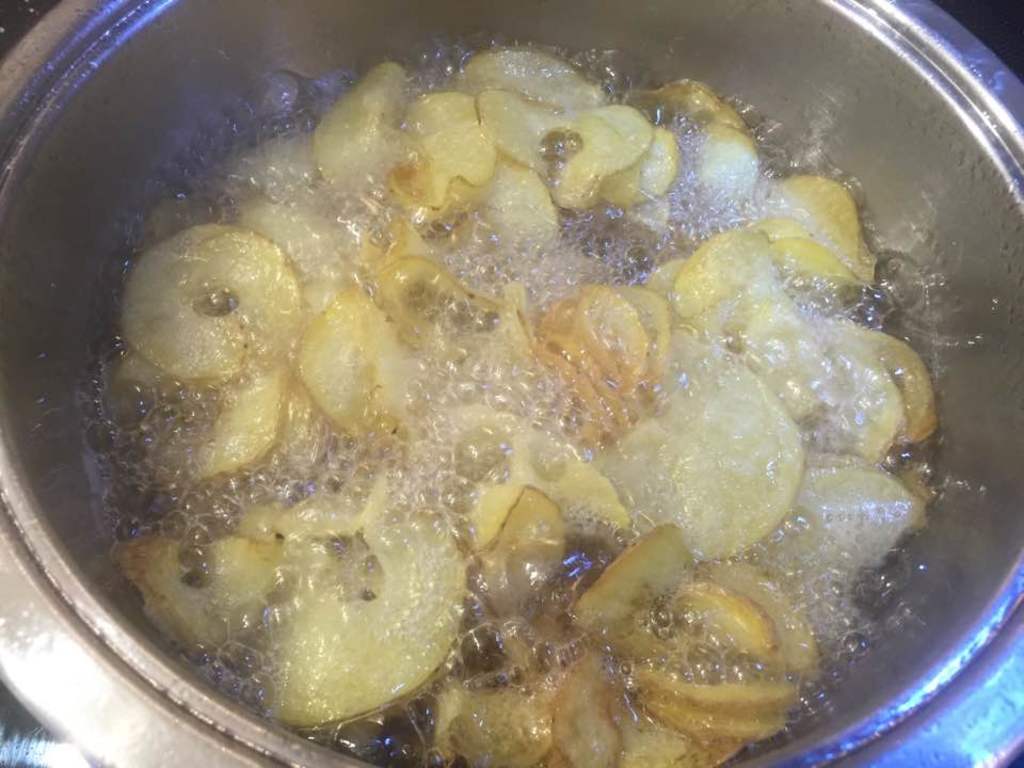 Da ich eine Heißluftfritteuse habe frittiere ich meine Chips immer im Topf.