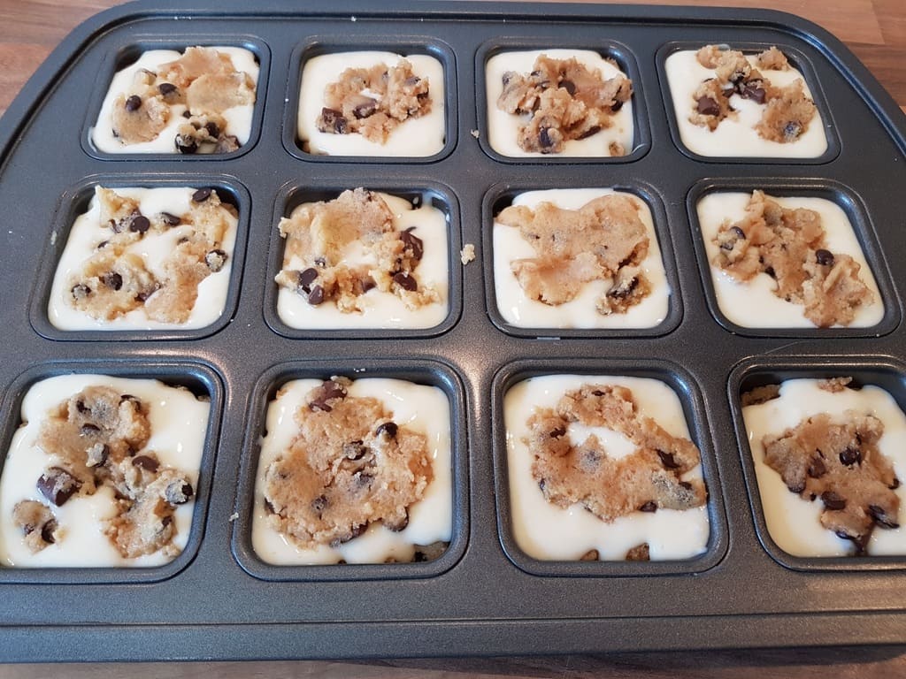 Ca. 3/4 der Teigmasse mit dem Portionierer in die Brownieform geben und schön flachdrücken.