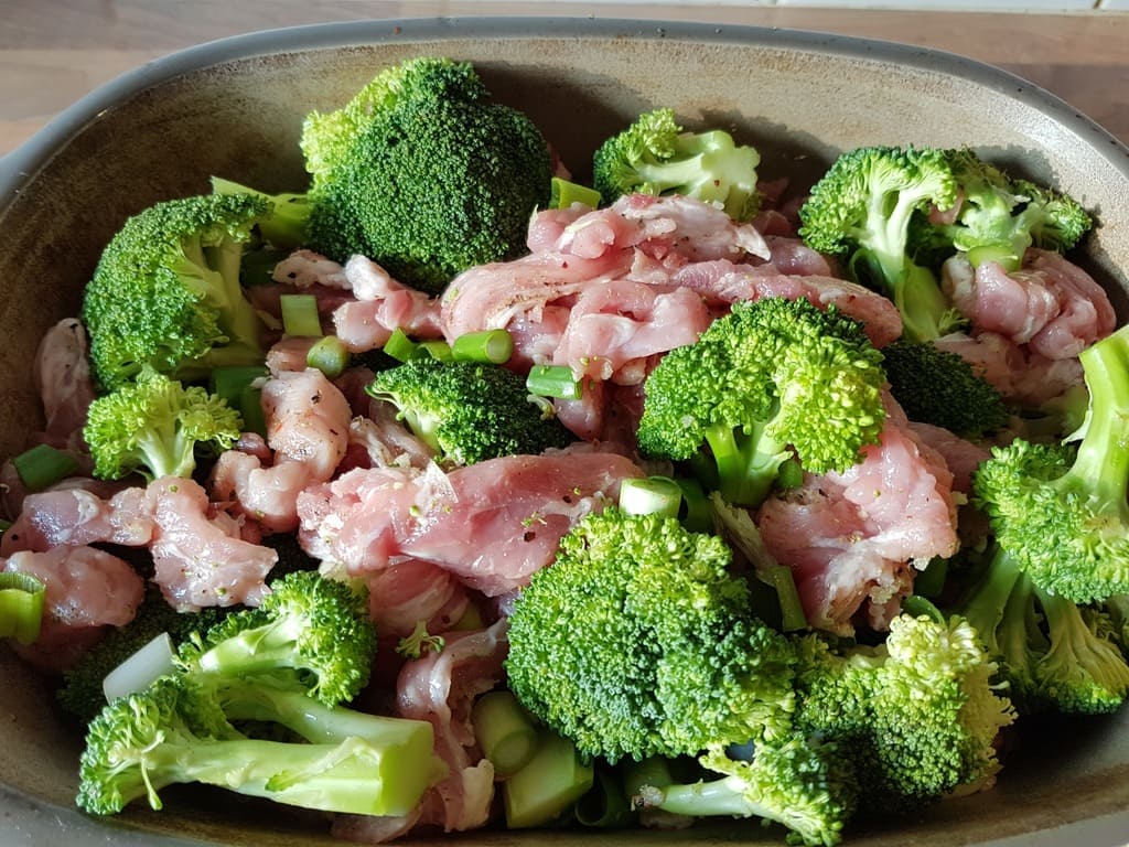 Das Geschnetzelte sowie die Brokkoli-Röschen und Frühlingszwiebel in den Ofenmeister geben und vermengen.