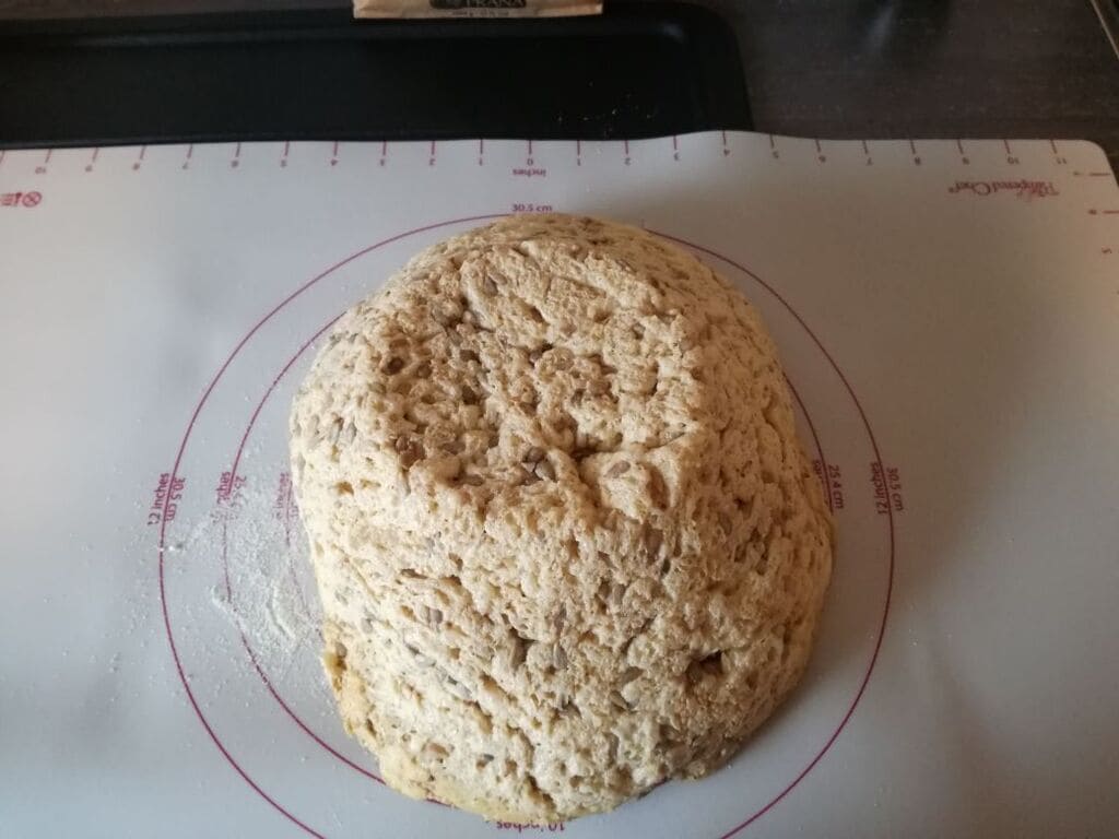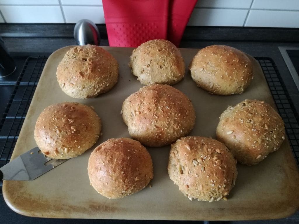 Nochmal gut durchkneten mit etwas Kokosmehl bestäuben, 8 Brötchen formen und auf den Zauberstein legen.