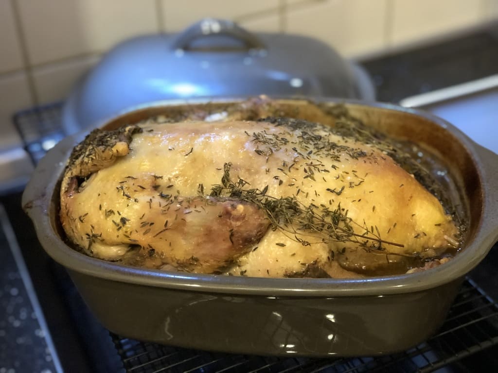 Die Servierplatte wieder in den Ofen geben und für ca. 20 bis 30 Min grillen für eine knusprige Haut.