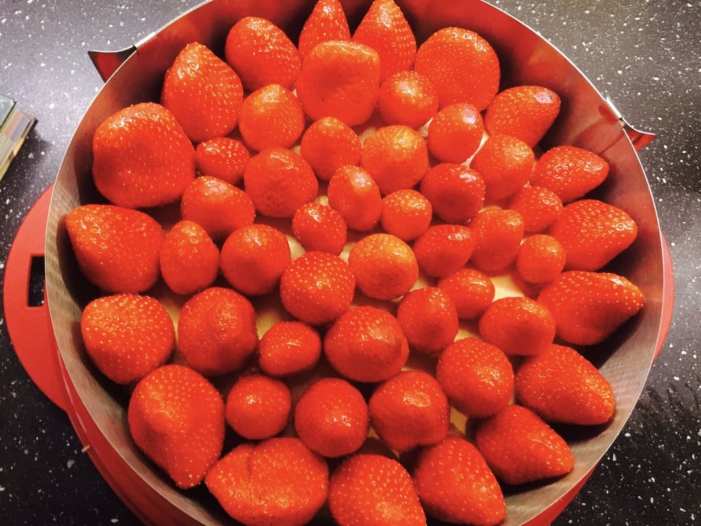 Den unteren Kuchenboden mit Erdbeermarmelade bestreichen und den Kuchen mit einem Tortenring fixieren.