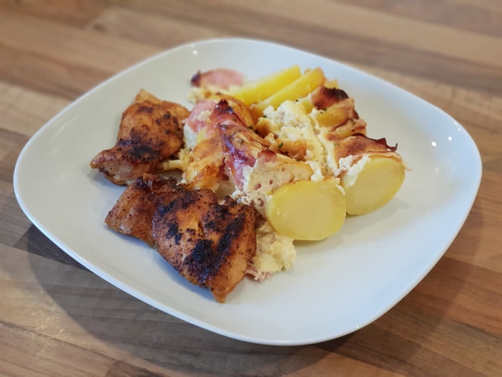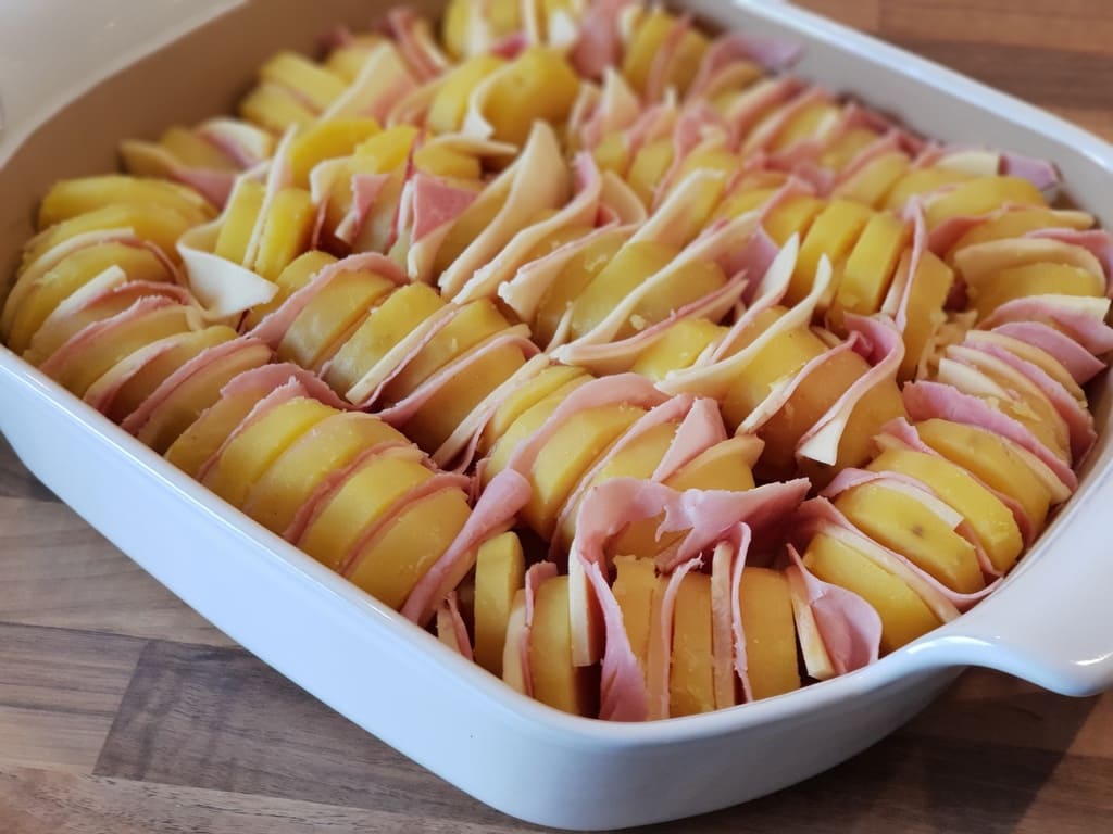 Käse und Schinken immer zwischen eine Scheibe Kartoffel legen und im großen Bäker platzieren.
