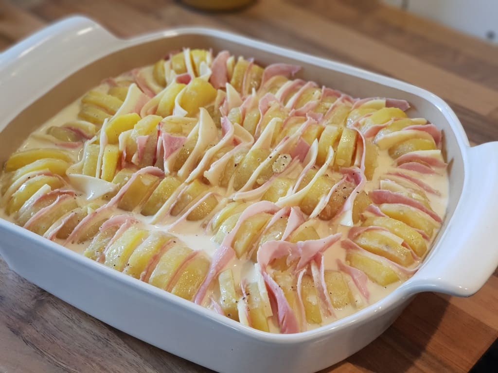 Sahne, Eier, Salz und Pfeffer mit einem Schneebesen vermischen und über die Kartoffelfächer gießen.