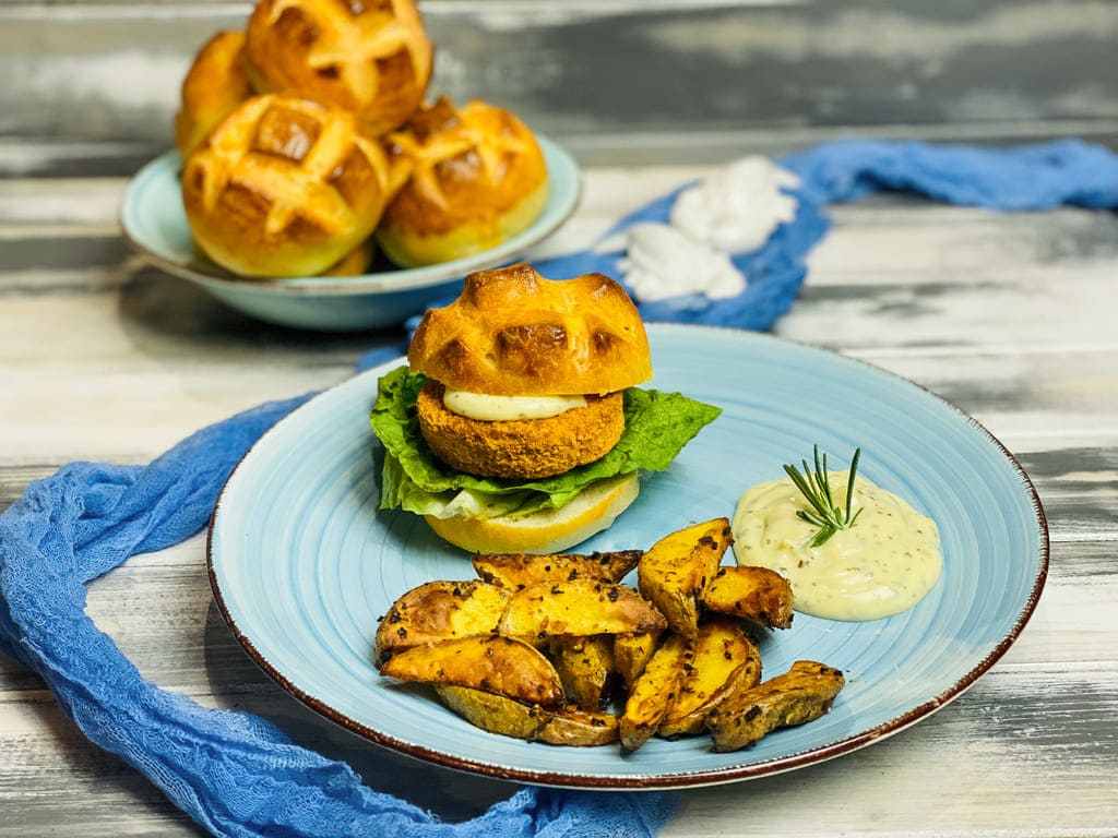 Tipp: Natürlich können diese Buns für alle möglichen Burger genutzt werden, aber unsere liebste Version sind diese Fischburger, mit selbstgemachter Remoulade von Myfoodstory, Salat und ein paar Kartoffelspalten.