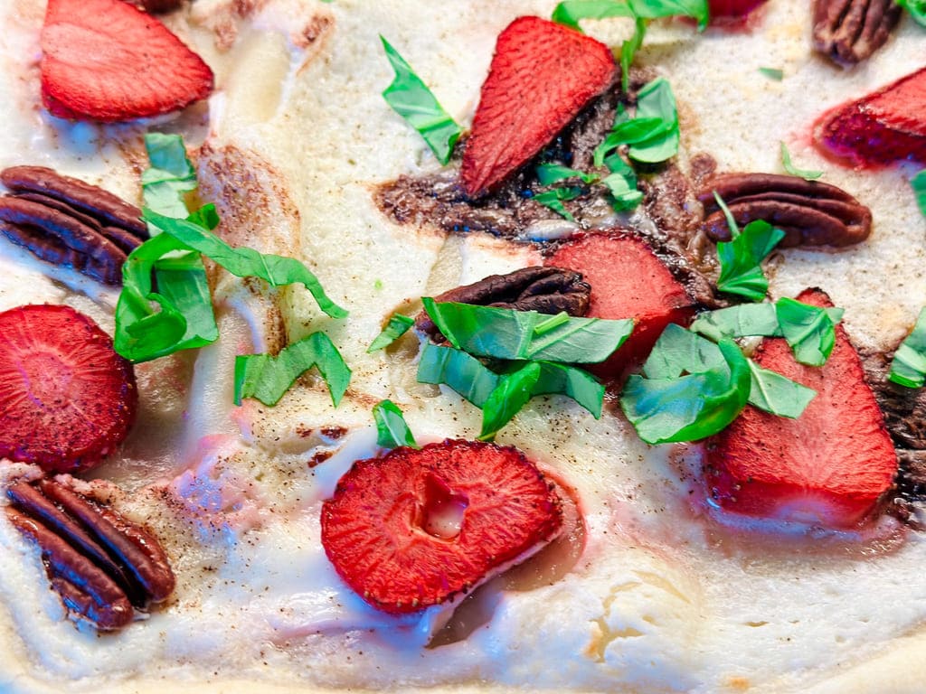 Flammkuchen mit Erdbeeren, Nutella, Pecannüssen und Basilikum