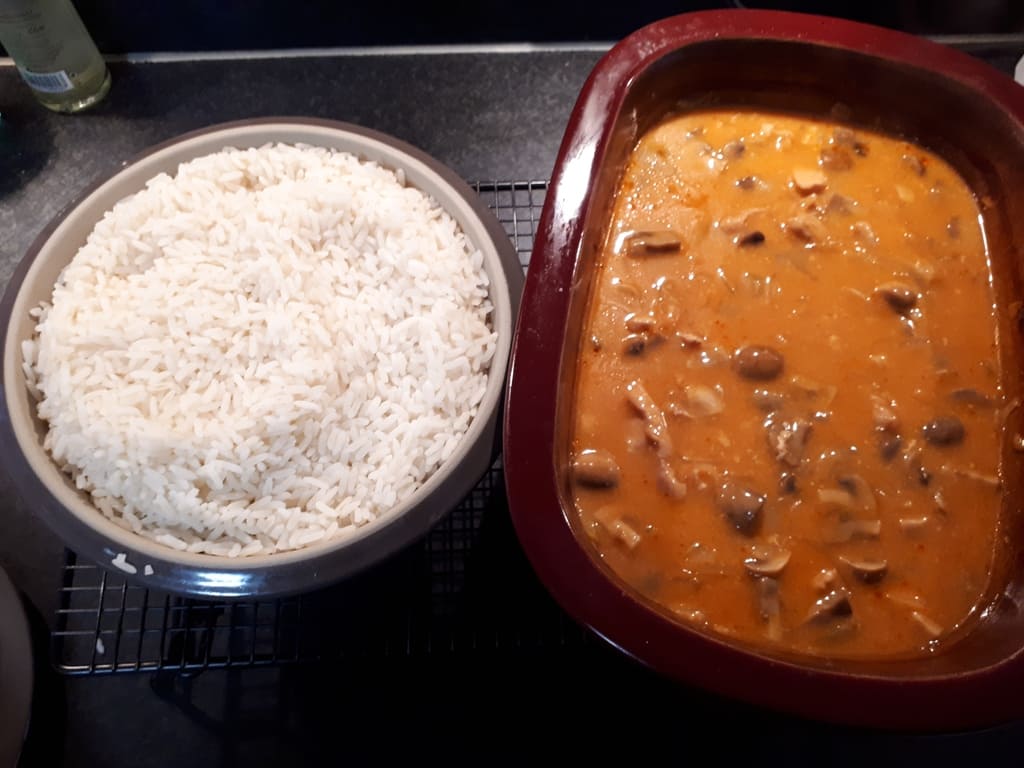 Nach 30 Min den Reis herausnehmen, das Geschnetzeltes umrühren und ggf. die Fleischstücke trennen und weitere 30 Min garen lassen.