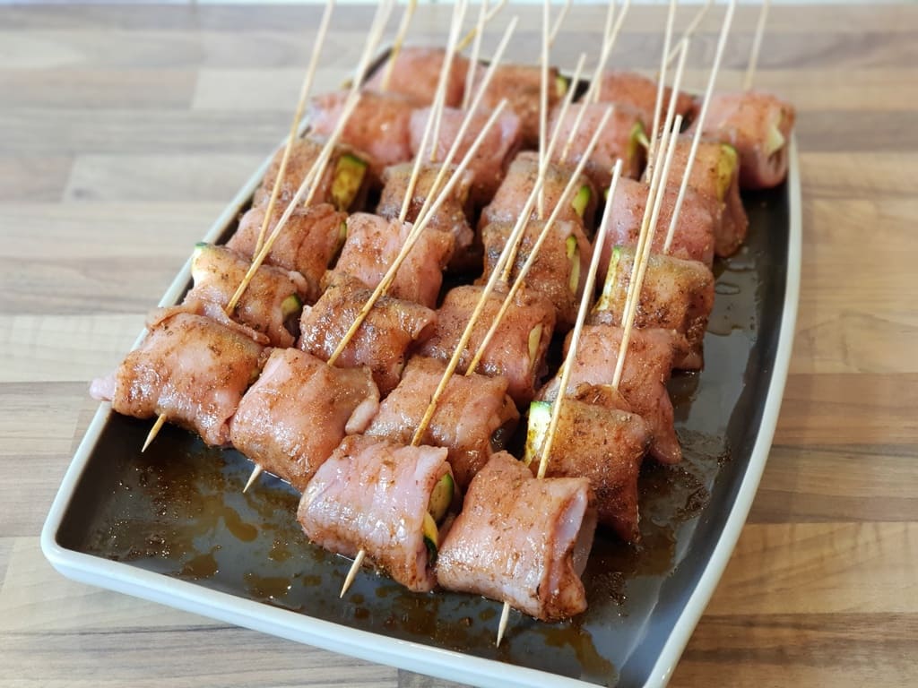 Nun mit der offenen Seite auf den Rouladenstreifen legen, ebenfalls aufrollen und mit dem Schaschlikspieß aufpiksen.