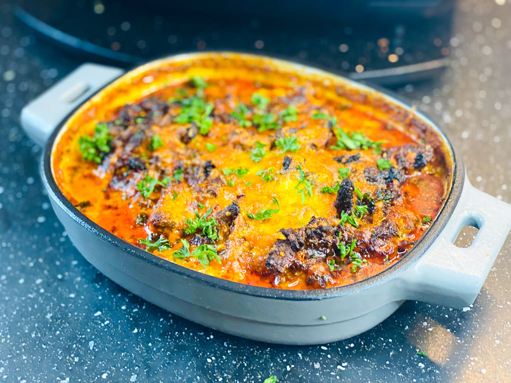 Gyros und Tomatenmark in den gusseisernen Bäker geben und auf die mittlere Schiene in den Air Fryer schieben.