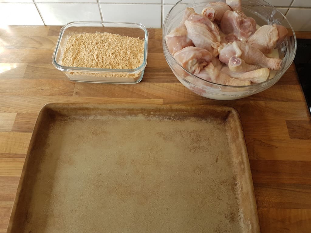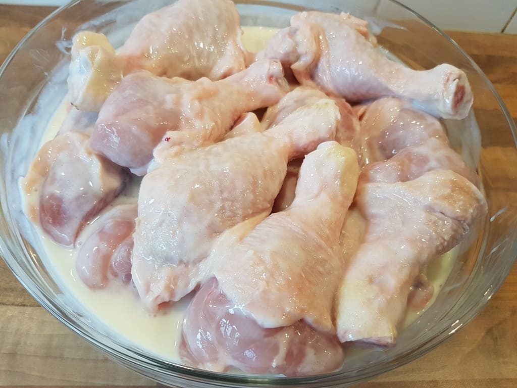Die Buttermilch mit 3 TL Salz vermischen und die Hähnchenkeulen über Nacht darin einlegen.