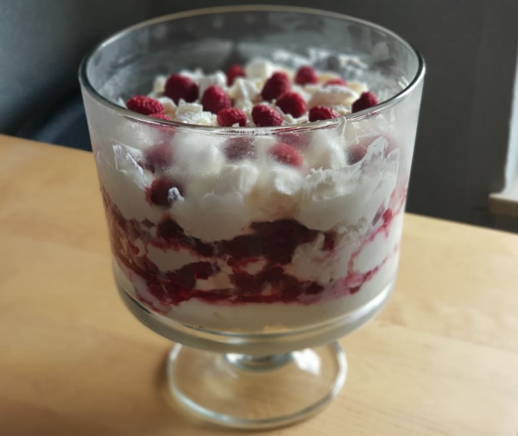 Nun in eine Glasschüssel 1/3 vom Sahne Quark hineingeben, anschließend 1/3 Baiser sowie 1/3 Himmbeeren.