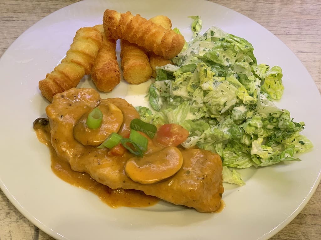 Bei uns wird das ganze mit Kroketten genossen, aber auch Kartoffeln, Reis, Nudeln oder Spätzle passen hervorragend.
