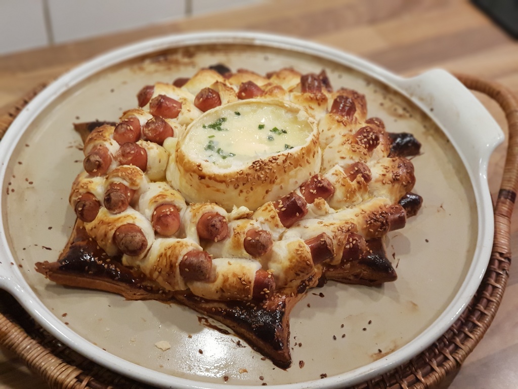Nach dem Backen den Deckel vom Käsefondue einschneiden zur Seite legen und mit den Blätterteigwürstchen in das Käsefondue tunken und genießen.