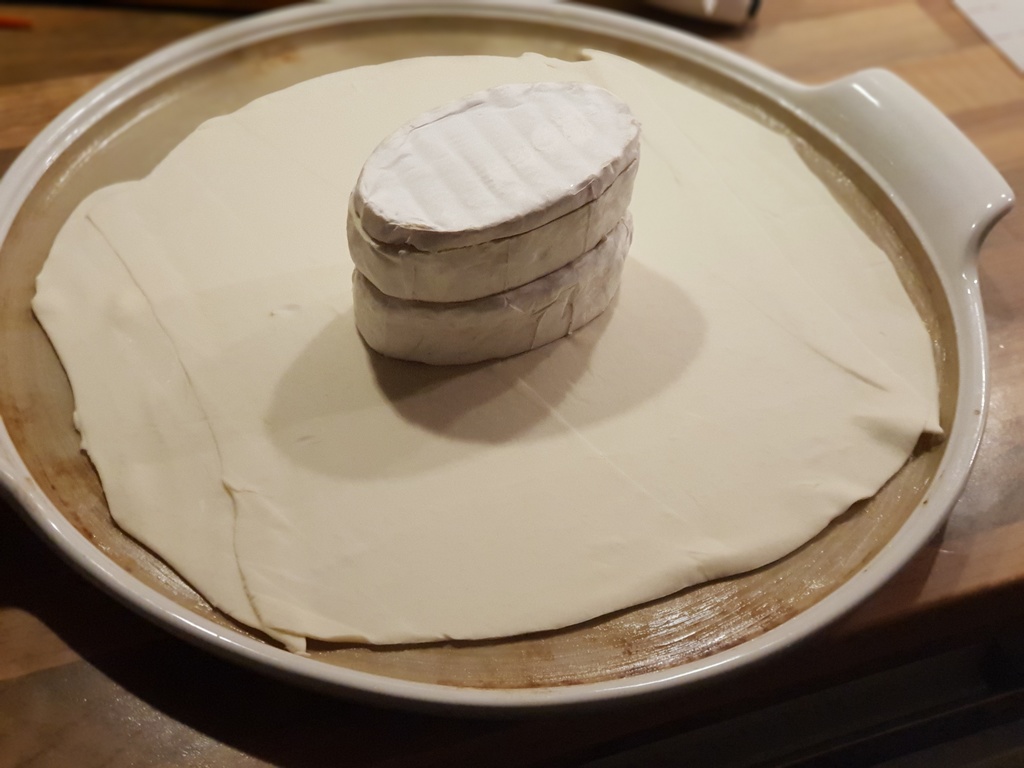 Einen runden Blätterteig auf die White Lady legen und die beide Brie mittig übereinander platzieren.
