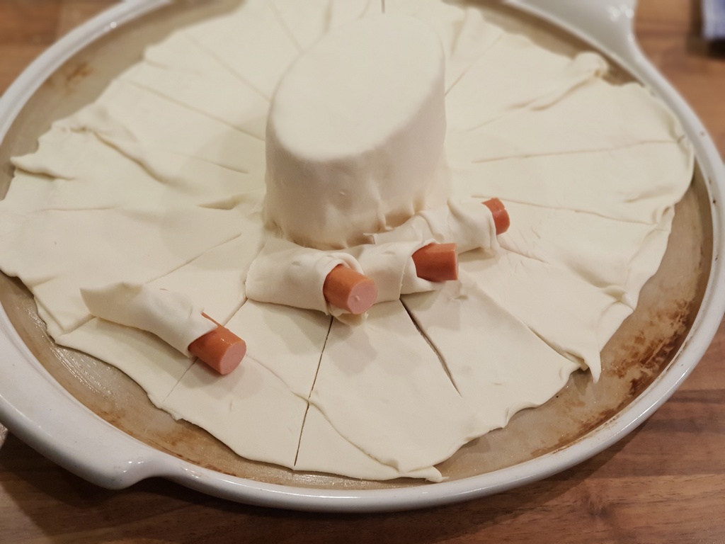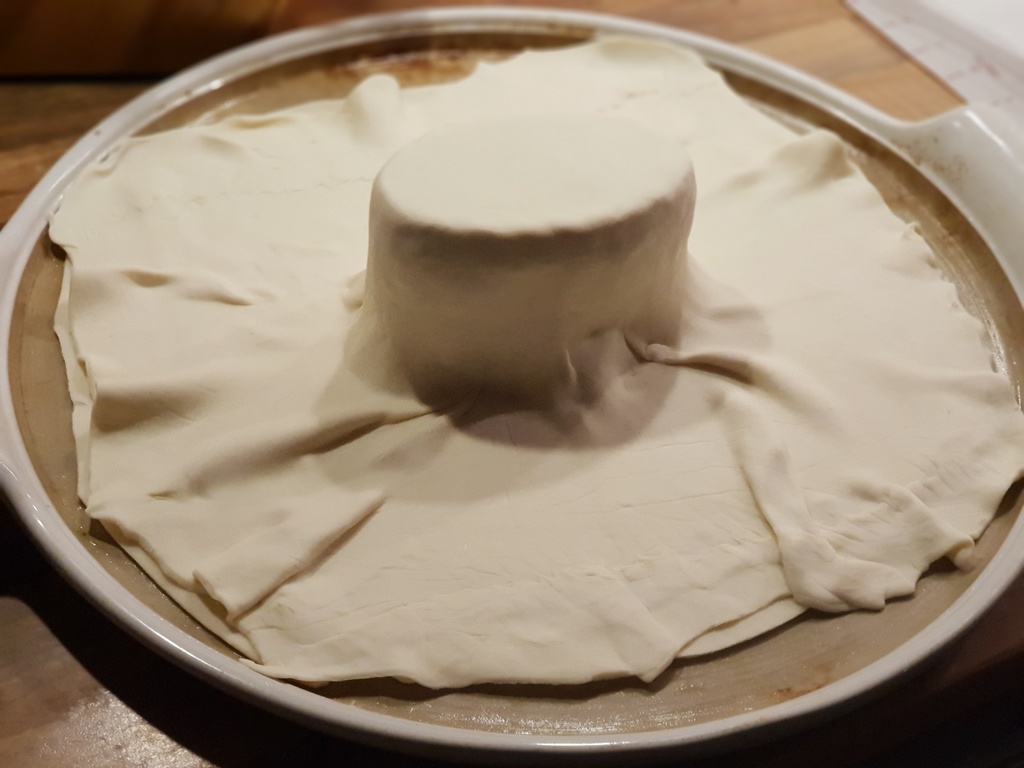 Den anderen Blätterteig drüber legen und sanft um den Käse legen damit keine Luftkammern dazwischen sind.
