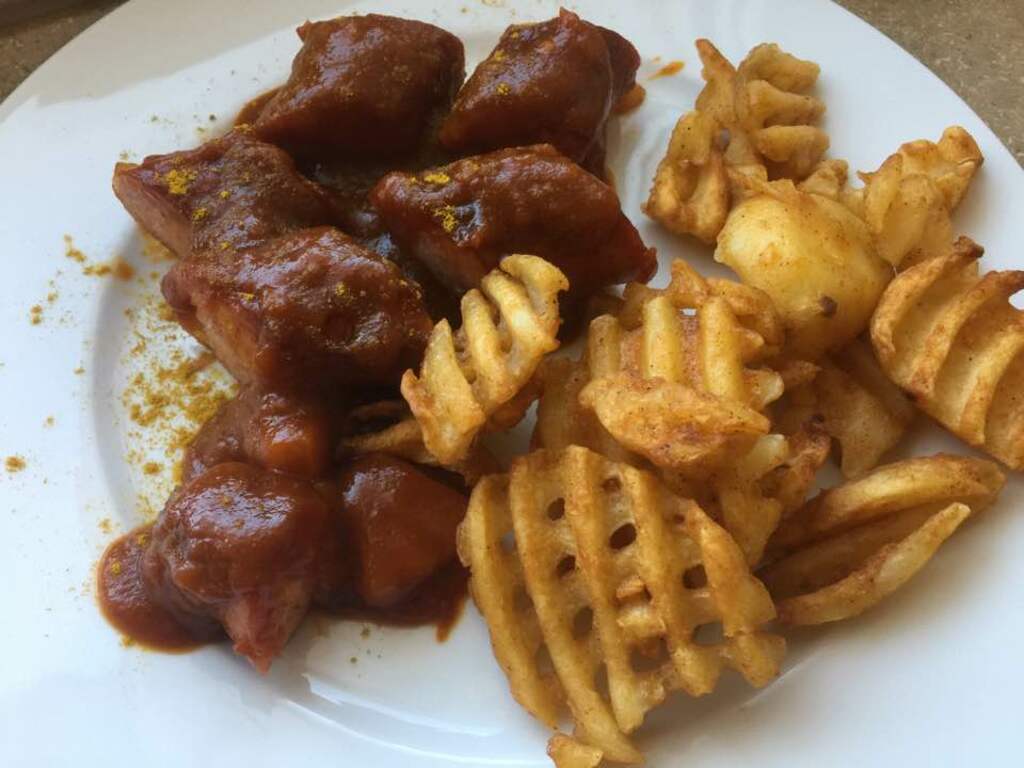 Wenn die Würstchen fertig sind können sie mit der Currysauce übergossen werden und kommen für weitere 10 Min in den Backofen geben.