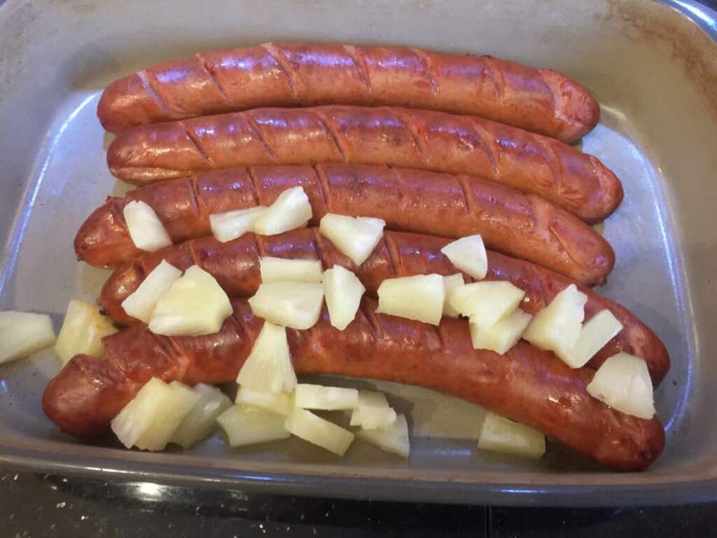 Bei der Karibik Version, die Ananasstückchen auf den Würstchen verteilen und dann die Sauce drübergießen.