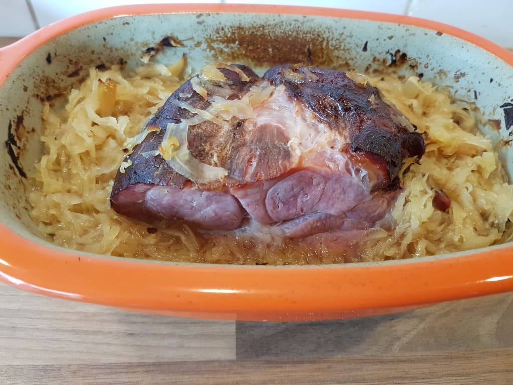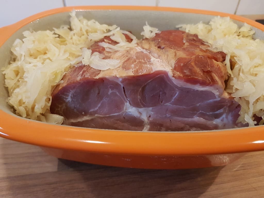 Kassler auf das Sauerkraut Betten und das Wasser drüber gießen.