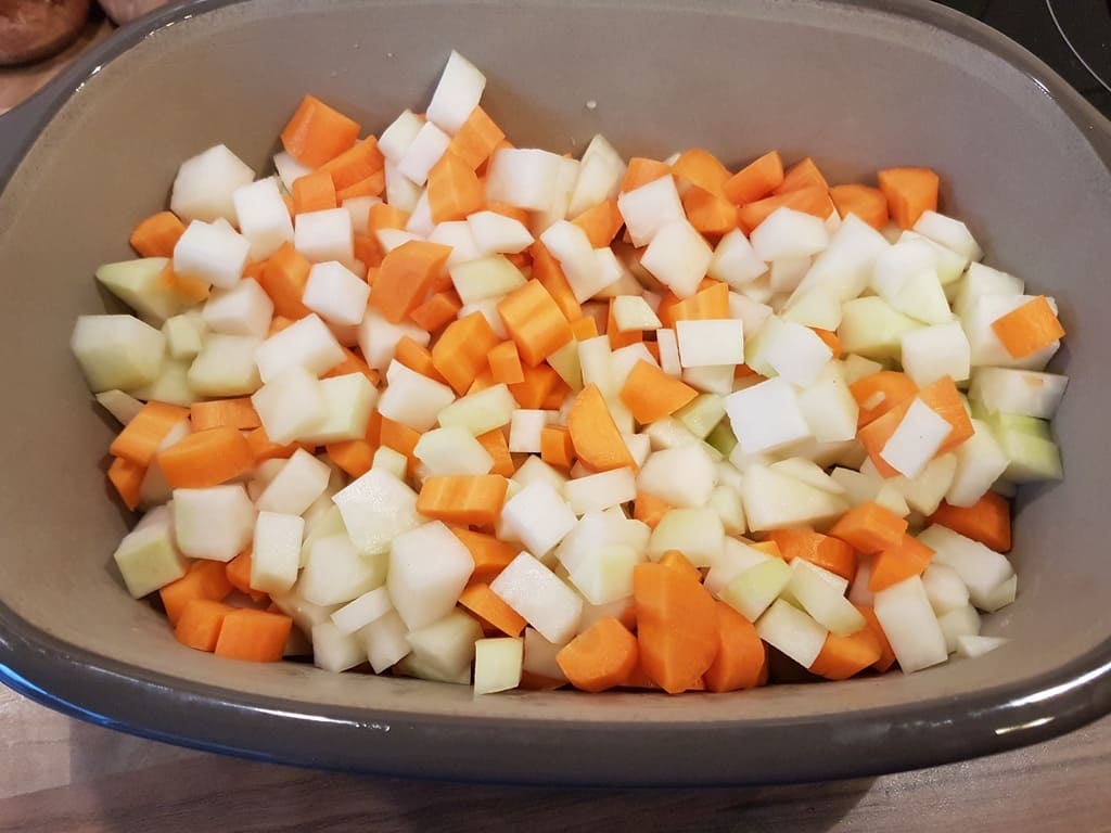 Kohlrabi und Karotten in Würfel schneiden, mit Hühnerfond, 1/2 TL Pfeffer, 1 EL Salz, Muskat und Chilli in den Ofenmeister geben und vermischen.