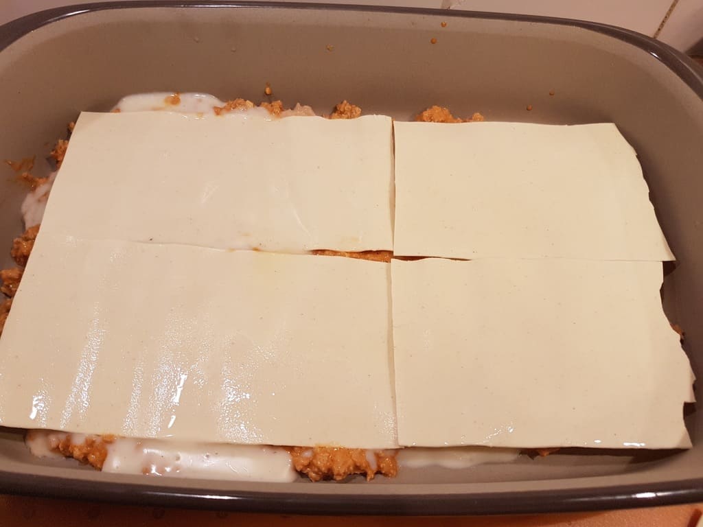 Anschließend die Lasagne Blätter drüber legen und wieder Hackfleisch.