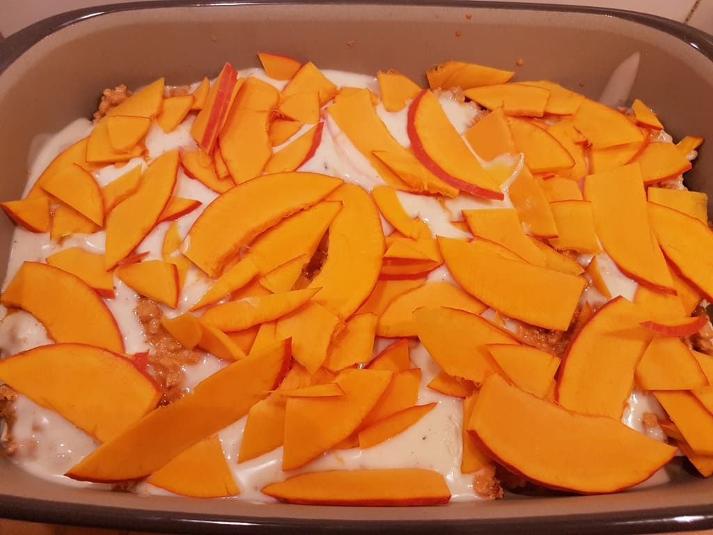 Dann etwas von der Bechamelsoße drüber gießen, sowie etwa die Hälfte von den Kürbisscheiben.