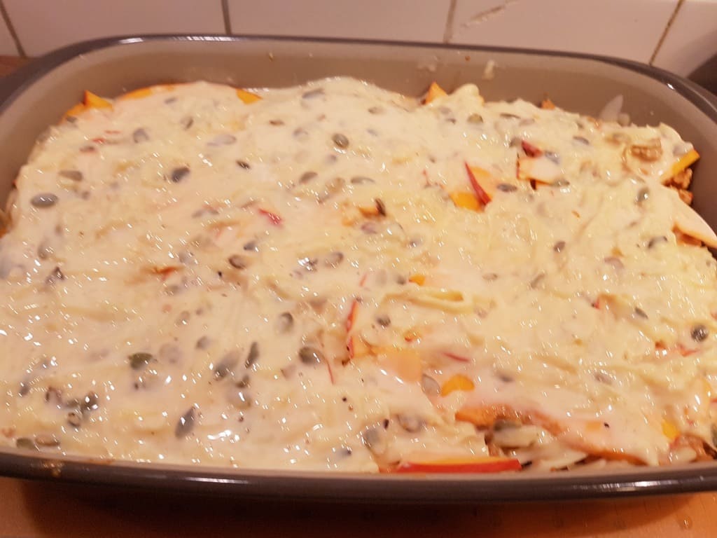 Etwas Bechamelsoße die übrig ist mit dem geriebenen Käse sowie den Kürbiskerne vermengen und auf der letzte Schicht verteilen.