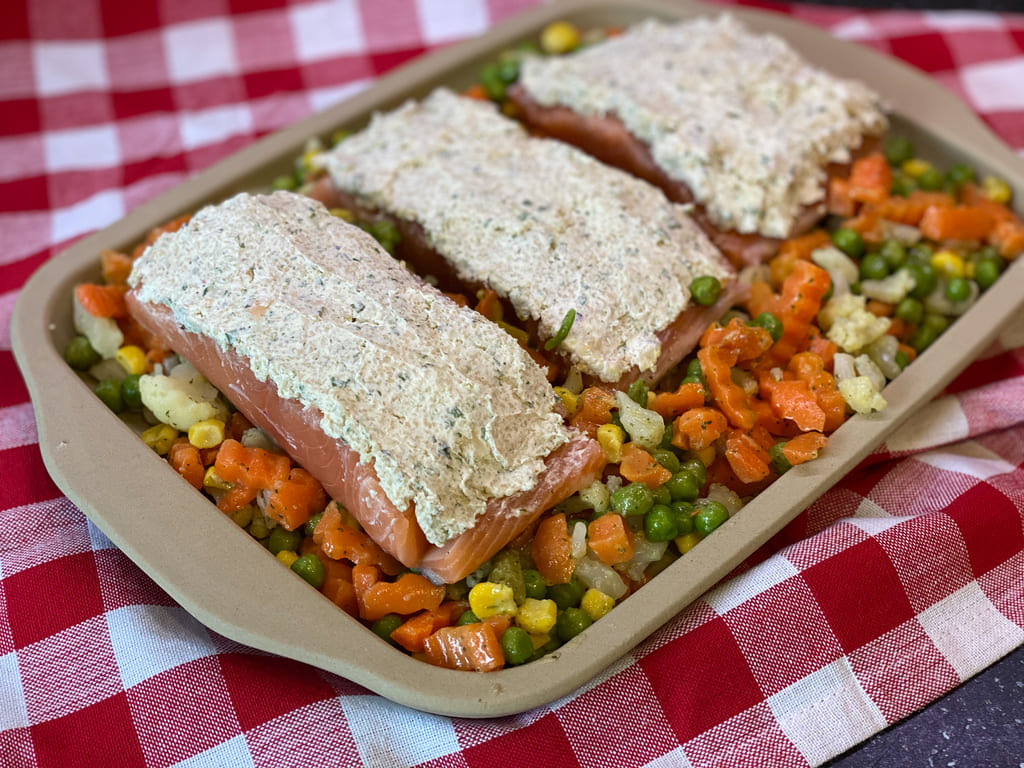 Den Lachs waschen, trocken tupfen und mit der Hautseite in die gefettete Auflaufform / TK Gemüse legen.