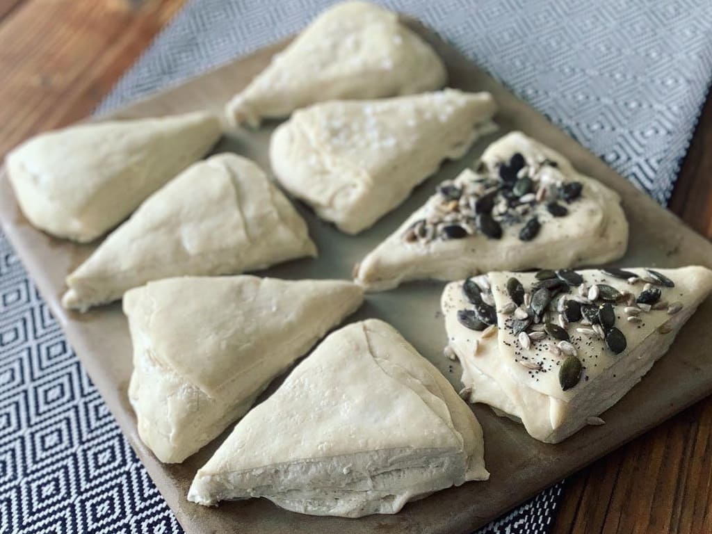 Die Teigkreise mit Butter bestreichen, aufeinander schichten, 30 Min. gehen lassen und nochmal 30 Min. in den Kühlschrank geben.