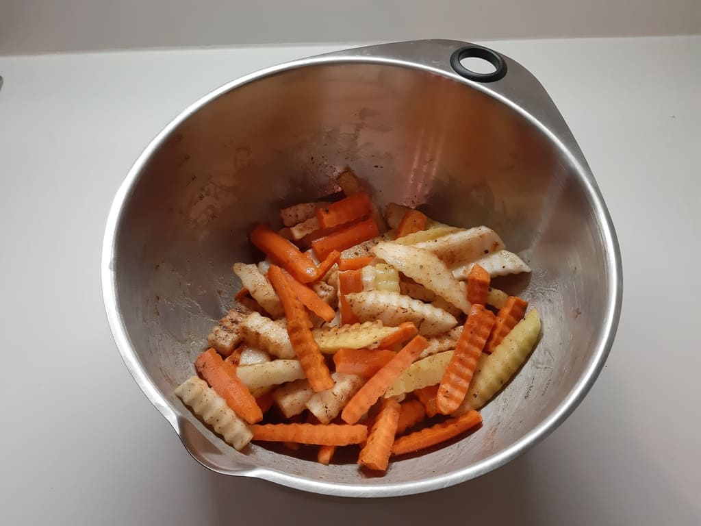 Das Gemüse in Sticks schneiden und in einer Schüssel mit dem Öl, Paprika- und Currypulver mischen und mit Salz und Pfeffer würzen.