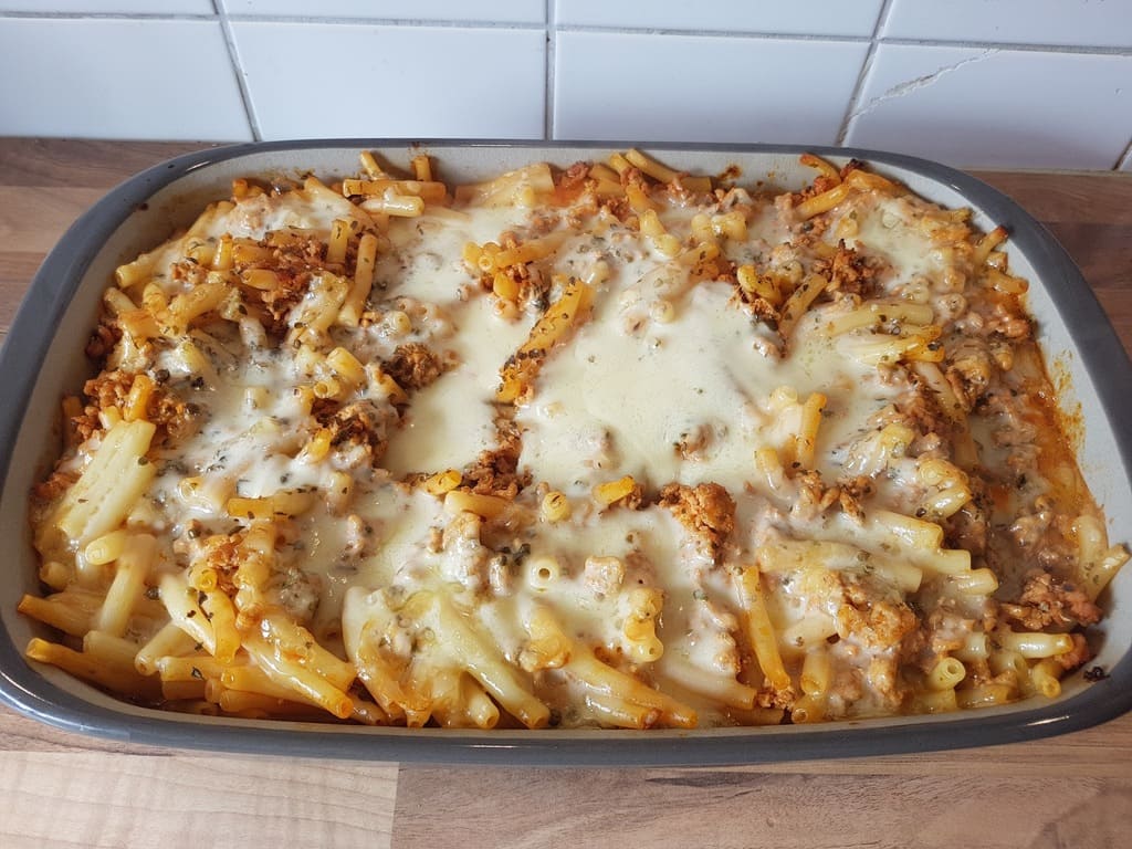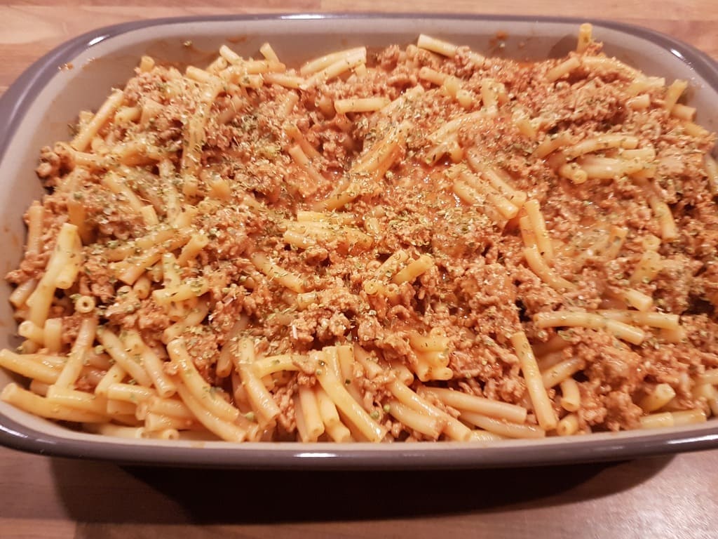 Maccaroni kochen in die Ofenhexe legen mit der fertigen Soße etwas vermischen.