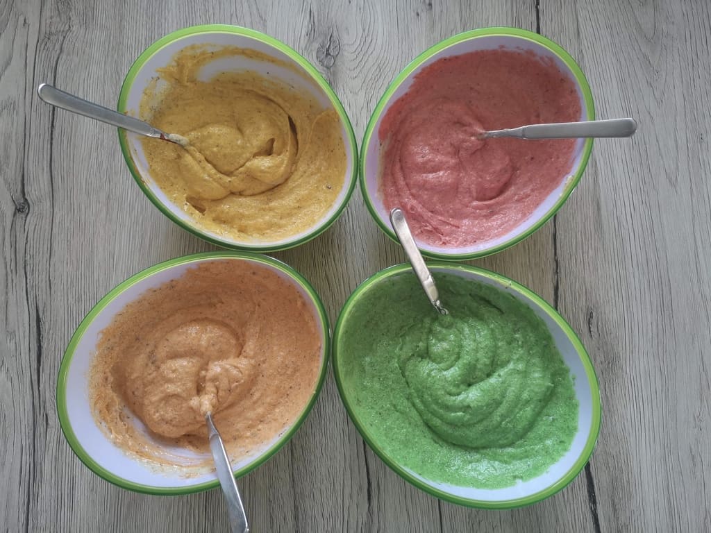 Den Teig in 4 Schälchen verteilen und mit jeweils 2 Tropfen Wilton-Lebensmittelfarbe (Gel) einfärben.