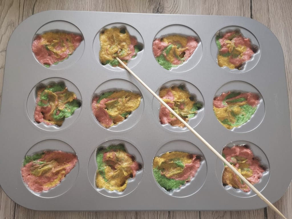 Nun den Teig in die mit Butter gefettete Form klecksen (Mulden nur halb befüllen) und die Farben mit einem Holzstäbchen leicht ineinander vermischen.