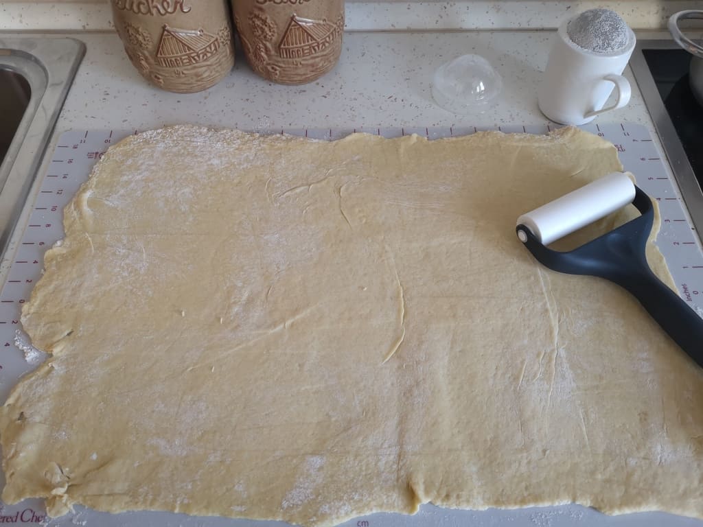 2 Min zu einem geschmeidigen Teig kneten, auf einer leicht bemehlten Teigunterlage ausrollen und die Masse auf den Teig streichen und aufrollen.