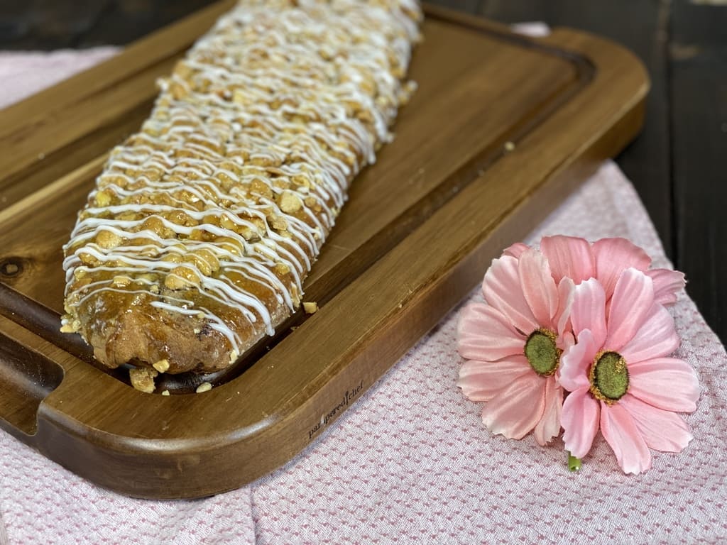 Für die Optik habe ich zum Schluss eine Puderzucker-Glasur in feinen Linien über den Striezel geben.