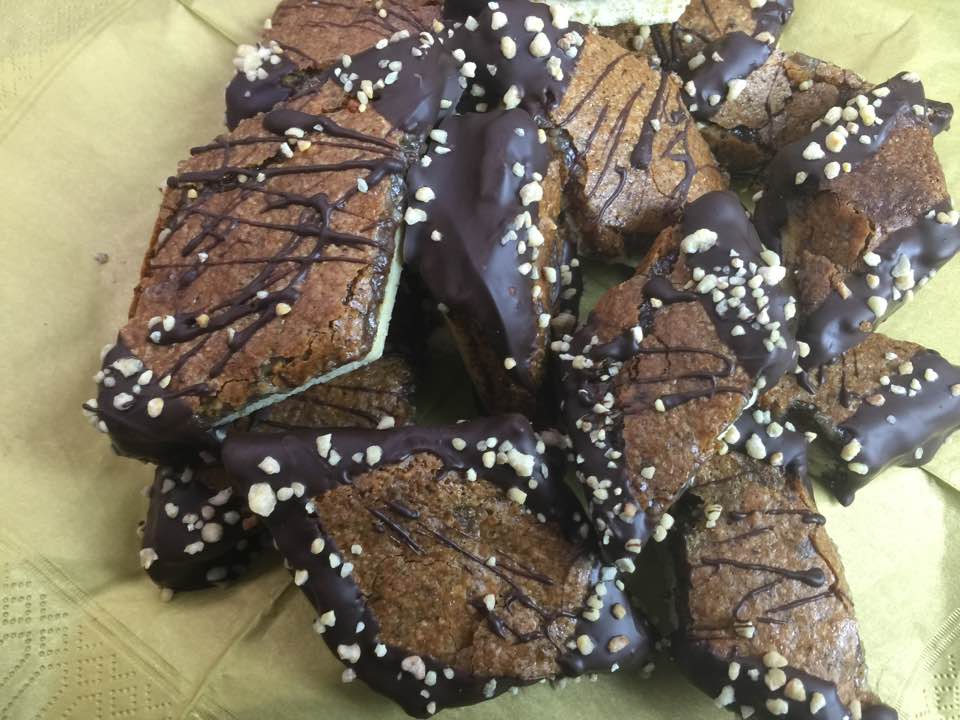 Nachdem die Nussecken komplett ausgekühlt waren, habe ich noch Kuvertüre im Wasserbad geschmolzen und die Ecken in die Schoki getaucht.