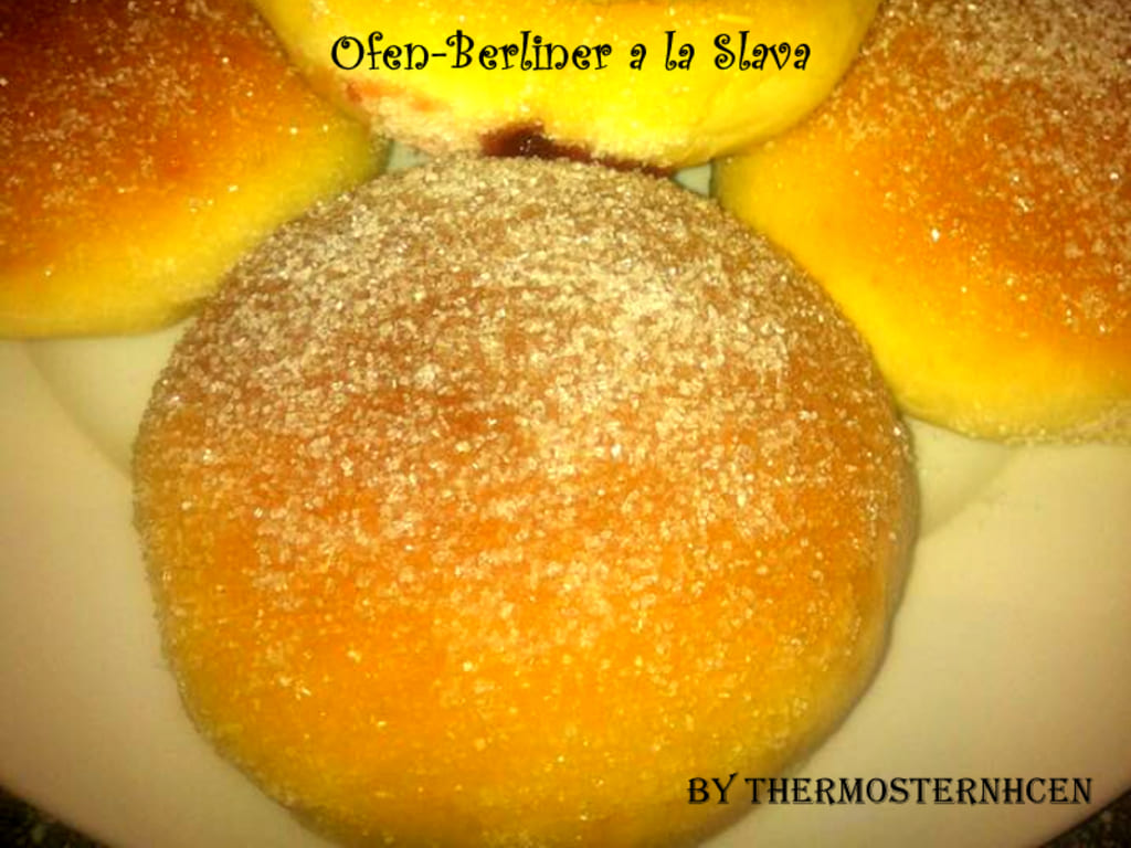Die Berliner mit flüssiger Butter bestreichen und in Zucker / Puderzucker wälzen.